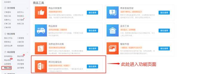 即可进入【商品批量投放】环节,正在【商品办理】—【商品东西中】找到【商详批量投放】,查看更多